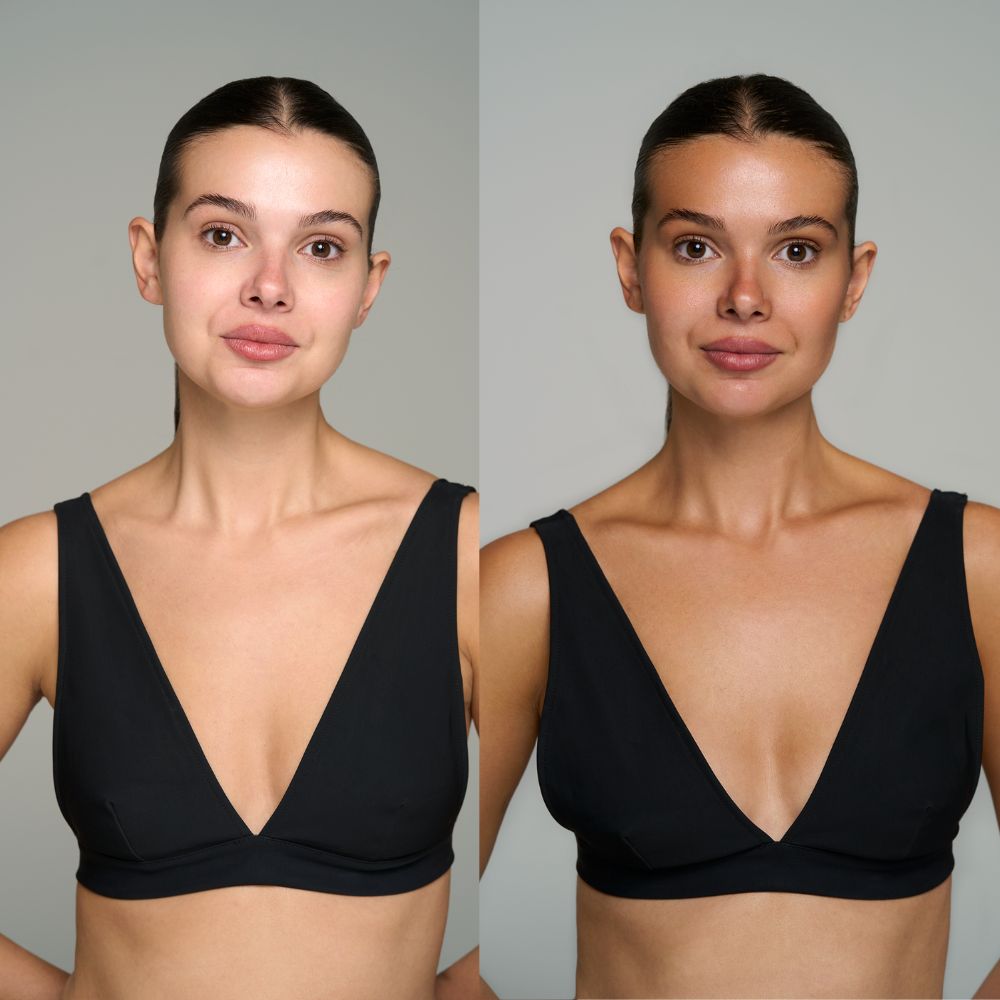 - Géén oranje gloed en géén typische self-tan geur